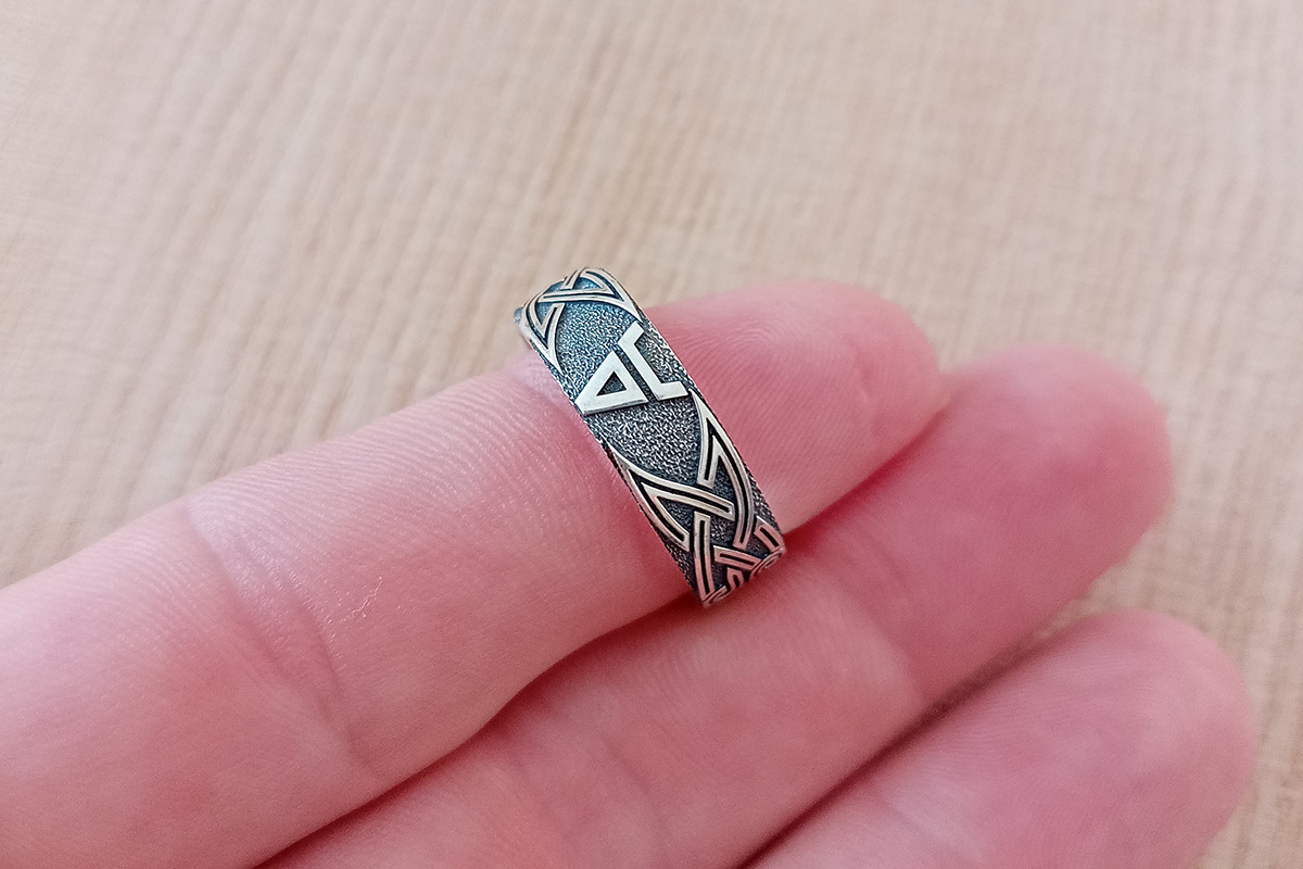 Кольцо с руническим компасом Вегвизир и рунами Тейваз (Тюр) - Путь Воина